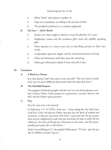 Discover and develop your prophetic gifts! Discovering the Seer in You by Jim Goll focuses on dreams, visions and open heavens, and reveals how you can cultivate this realm of the prophetic in your life. Filled with exercises, Scriptural insights and teaching, this workbook will expand your knowledge of supernatural gifts.