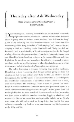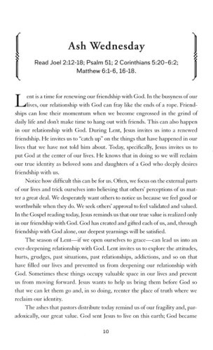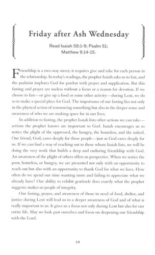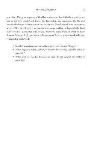 Lent offers us the opportunity to deepen our friendship with God. The idea of being friends with God may intimidate some, but the authors of this book provide practical tips for developing a closer relationship with God. Set aside at least 15 to 20 minutes each day to spend with God, the introduction suggests. Read the scripture texts and reflections, and pay attention to what they evoke in you. Then talk to God about your thoughts and feelings just as you would to your best friend.