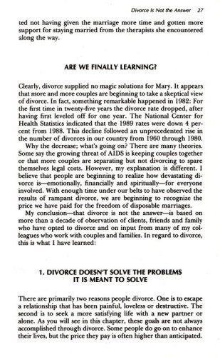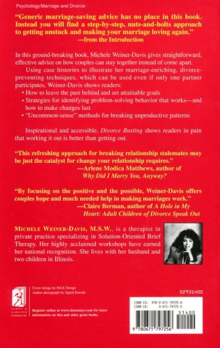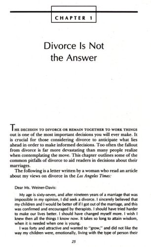 Using case histories to illustrate her marriage-enriching, divorce-preventing techniques, which can be used even if only one partner participates, Weiner-Davis shows readers: