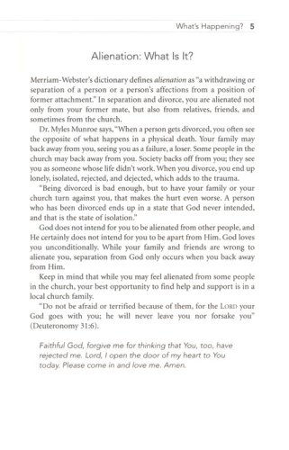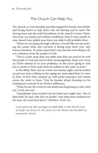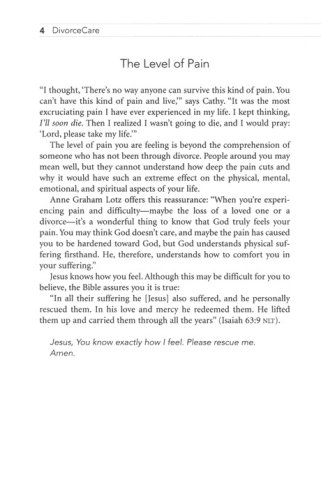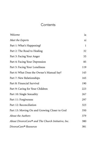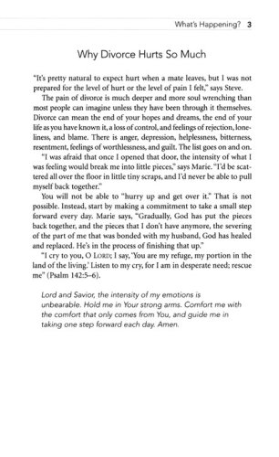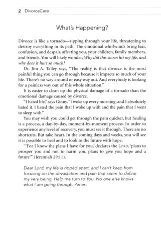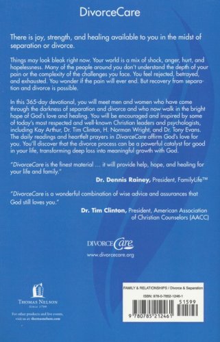 In this 365-day devotional, you will meet men and women who have come through the darkness of separation and divorce and who now walk in the bright hope of God's love and healing. You will be encouraged and inspired by some of today's most respected and well-known Christian leaders and psychologists, including Kay Arthur, Dr. Tim Clinton, H. Norman Wright, and Dr. Tony Evans. The daily readings and heartfelt prayers in DivorceCare affirm God's love for you. You'll discover that the divorce process can be a powerful catalyst for good in your life, transforming deep loss into meaningful growth with God.