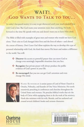 In today's fast-paced society it is easy to get distracted until your much-needed time with God is lost. But God wants your attention more than anything. The Bible is filled with examples of great men and women who would not leave God alone. Their cries to God changed their lives, the lives of others and altered the course of history. "Don't Leave God Alone" explains the way to develop this type of personal relationship with God, the kind that moves His heart and makes a difference in the world.