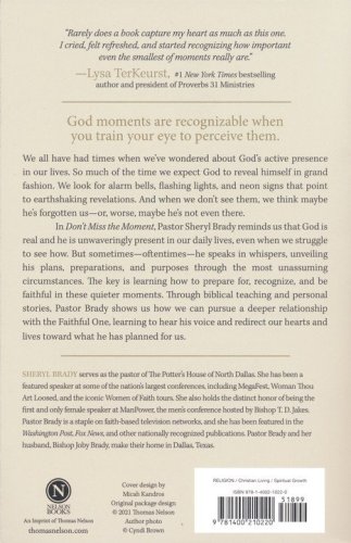 In Don’t Miss the Moment, Pastor Sheryl Brady reminds Christians that God is real and unwaveringly present in our daily lives. Through biblical teaching and personal stories of God showing up in times of need, she shows how to pursue deeper relationship with the Faithful One so that we can learn to hear his voice and feel his leading, discern when we are in a defining moment, and redirect our hearts and lives toward his plans and purposes.