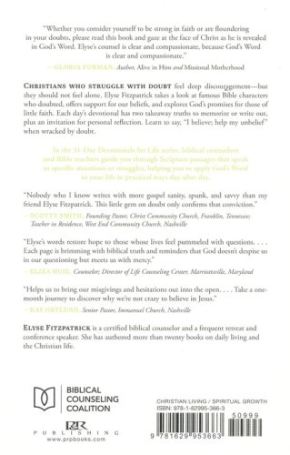 Whether you’re new to the walk of faith or have been a Christian for decades, you probably find yourself wondering: Is it all really true? If so, why isn’t my life what I hoped it would be? And, most of all, why am I still struggling to believe? Our trouble with doubt is discouraging—but it doesn’t mean we’re alone in our Christian walk! We are naturally prone to unbelief; all Christians are Doubting Thomases. The Bible itself is full of people who doubted—sometimes while talking directly with God! Elyse Fitzpatrick reminds us of famous Bible characters who doubted, offers evidences to bolster our belief, and relays the promises God has made to those of little faith. Each day’s devotional has two takeaway truths to memorize or write out, plus an invitation for personal reflection, to help you say “I believe; help my unbelief” when discouraged by your doubt.