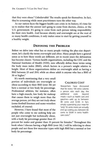 Too many people fight against their own brain and body chemistry when trying to lose weight. This is the reason that up until now, diets have only had a 2% success rate. Tired of saying, "I can't do this!" when looking at diet programs? Then let Dr. Colbert help you take advantage of the latest medical breakthroughs that show you how to work with your body, rather than against it to lose weight easily and keep it off for life. Forget the old diets that work against you. With Dr. Colbert's diet, you can say, "I can do this!"
