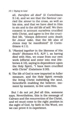 Dying To Live has four short chapters dealing with the relationship of Christ's death to the life of the Christian believer. The Christian who affirms "I have been crucified with Christ" has found the way that brings: Freedom from sin and self Transformation to his life, both internally and externally Total surrender to God Identification with Christ's death on the cross The book speaks to the individual in a personal way of the ongoing implications of Christ's cross for the Christian and declares "It is God's plan that He must be allowed to work into the lives of His messengers the truth He entrusts them to give to others."
