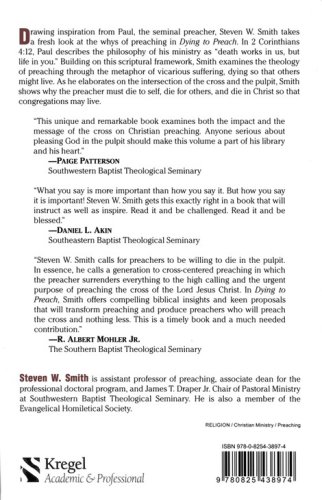 Drawing inspiration from the seminal preacher, the apostle Paul, Steven W. Smith takes a fresh look not just at the how of preaching, but at the whys. In 2 Corinthians 4:12, Paul describes the philosophy of his ministry as "death in us, but life in you." Building on this scriptural framework, Steve Smith illustrates the theology of preaching through the metaphor of vicarious suffering, dying so that others might live. As he elaborates the intersection of the cross and the pulpit, Smith shows why the preacher must die to self, die for others, and die in Christ so that congregations may live.