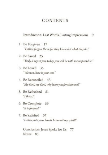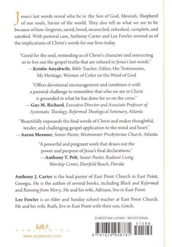 Anthony Carter and Lee Fowler take a brief, devotional look at each of our Savior's nal seven sayings on the cross. These words reveal who Jesus is: the Son of God, Messiah, Shepherd of our souls, Savior of the world. They also tell us who we are to be because of him:forgiven, saved, loved, reconciled, refreshed, complete, and satisfied. The work and words of Christ accomplish and announce the good news of salvation by grace-our response is the joy of living and loving in light of that good news. With pastoral care, Carter and Fowler remind us of the moving drama of our salvation and the implications of Christ's words for our lives today.