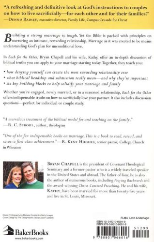 Marriage requires not just love, but sacrificial love, says Bryan Chapell. In his newly revised and updated book, Each for the Other, he shows married couples how to emulate the unselfish, sacrificial love of Christ. While imparting invaluable instruction grounded in Scripture, Chapell not only helps husbands and wives understand the nature of God's care but also affirms the importance of building a spiritual foundation that binds them together as one. By presenting a biblical model of marriage, Chapell encourages couples to dive into the deeper dimensions of their relationship. The result, he says, is a Christ-centered marriage and a grace-filled family.