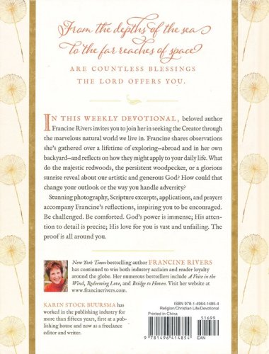 Millions of readers have been transformed and inspired by Francine Rivers’ bestselling novels Redeeming Love and A Voice in the Wind. Now, in this weekly devotional, the beloved author invites you to join her in seeking the Creator through the marvelous natural world we live in. Francine shares observations she’s gathered over a lifetime of exploring—abroad and in her own backyard—and reflects on how they might apply to your daily life. What do the majestic redwoods, the persistent woodpecker, or a glorious sunrise reveal about our artistic and generous God? How could that change your outlook or the way you handle adversity?
