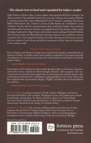 Eight Theories of Justice offers a major update and expansion of the earlier text. Together with coauthor Matthew J. Gaudet, Lebacqz presents the major alternative views of justice, including John Stuart Mill's utilitarianism, the contract system of John Rawls, the entitlement views of Robert Nozick, and the communitarian ideas of Michael Sandel. These political and philosophicalaccounts of justice are supplemented with analysis of major theological approaches: Pope Francis and Catholic social teaching, Reinhold Niebuhr and Christian realism, the Black liberation theology of James Cone, and Katie Cannon's womanist ethics. Each chapter introduces the major elements of each theory, presents the best critiques of each theory, and offers an assessment of their value for living justly in the modern world.