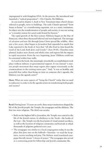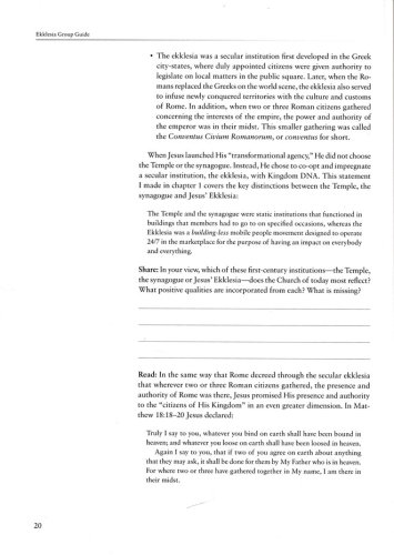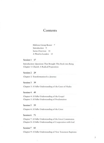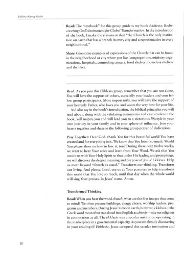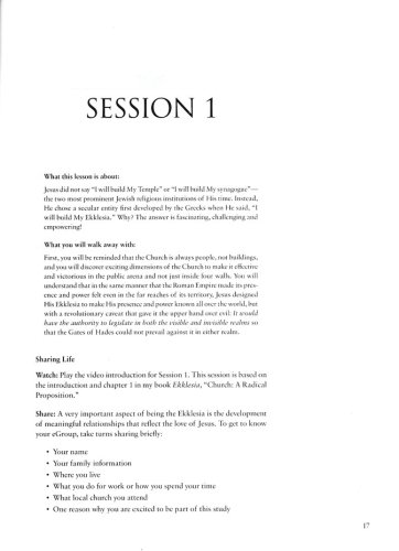 Designed to be used in conjunction with the book (SKU: 798444) and the DVD (SKU: 798480), the Ekklesia Group Guide contains everything a facilitator needs to lead a small group class as well as serves as a place for noting responses to discussion questions and writing down personal reflections. It is recommended that each participant have his/her own copy of the group guide. Each session in the guide includes the following main sections: