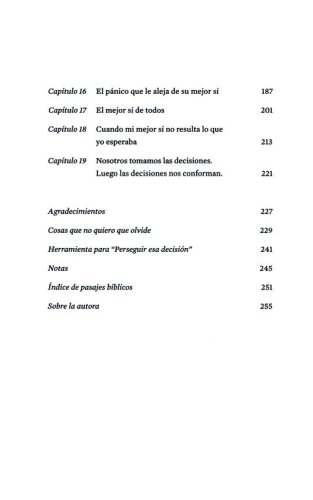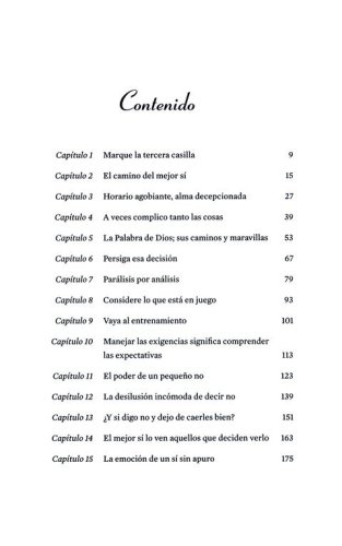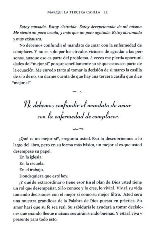 Curar la enfermedad de agradar a los demás, ayudándole a entender el mandato bíblico de amar a los demás.Escapar de la vergüenza y la culpa de defraudar a los demás aprendiendo el simple hecho de decir no.Vencer la agonía de las decisiones difíciles adoptando un proceso de decisiones basado en la sabiduría.Elevarse por encima de las demandas interminables y descubrir su mejor sí hoy.