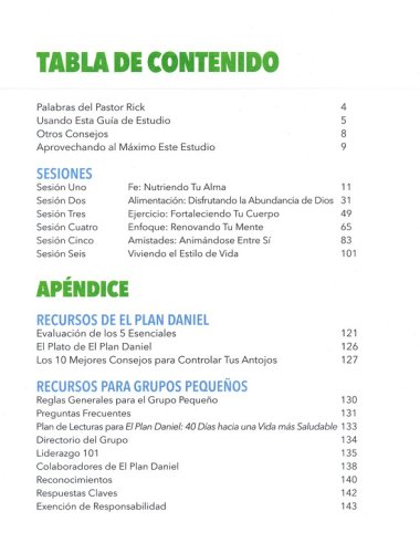 Estas seis sesiones de estudio para grupos pequeños, basado en videos, de Rick Warren, el Dr. Daniel Amen y el Dr. Mark Hyman, están centradas en cinco esenciales que lanzarán tu viaje hacia la salud: fe, alimentación, ejercicio, enfoque y amistades. Con el apoyo de expertos médicos y en ejercicio, el Pastor Rick Warren y miles de personas de su congregación comenzaron un viaje para transformar sus propias vidas. Se llama El Plan Daniel, y funciona por una sencilla razón: Dios diseñó tu cuerpo para estar sano, y proporcionó todo lo que necesitas para desarrollarte y vivir una vida abundante.