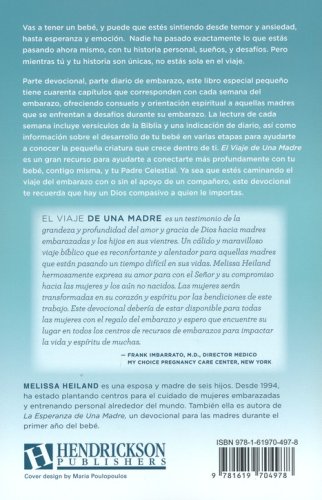 Parte devocional, parte diario de embarazo, este libro especial pequeño tiene cuarenta capítulos que corresponden con cada semana del embarazo, ofreciendo consuelo y orientación espiritual a aquellas madres que se enfrentan a desafíos durante su embarazo. La lectura de cada semana incluye versículos de la Biblia y una indicación de diario así como información sobre el desarrollo de tu bebé en varias etapas para ayudarte a conocer la pequeña criatura que crece dentro de tí. El Viaje de Una Madre es un gran recurso para ayudarte a conectarte más profundamente con tu bebé, contigo misma, y tu Padre Celestial. Ya sea que estés caminando el viaje del embarazo con o sin el apoyo de un compañero, este devocional te recuerda que hay in Dios compasivo a quien le importas.