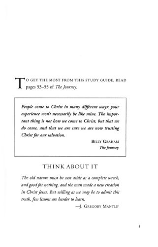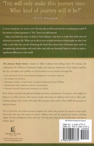 Is God working in your life?  Do you rely on Him each day for everything you need?  If the answer to these questions is "Yes," have you told anyone? Many new believers come to faith in God without a clue how to make their faith real and relevant to everyday life.  What can we do in our everyday activities to help people see who God really is and what He can do?  Embracing the Good News shows how Christians must work on strengthening relationships with each other and with our heavenly Father in order to make a significant difference in the world. The Journey Study Series is based on Billy Graham's best-selling book The Journey, the culmination of a lifetime of spiritual insight and ministry experience.  Each chapter explores the joys, triumphs, and conflicts we all encounter on our journey through life.Use for self-study or shared experience in small groupssix weeks of lessonssidebars offer a scriptural journey through God's wordquestions for starting group discussionsInsight-filled scripture passages to studyEach chapter includes thought-provoking questions, commentary, scriptures, and insights to help you on life's journey.  Each lesson teaches the secret of walking with God on life's path.  Understanding God's truths will make life's journey easier and let Him fulfill His promise to lead you home.