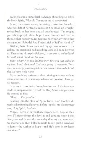 Offering miraculous, inspiring stories of lives and circumstances transformed by the Holy Spirit, author and speaker Kim Meeder shows that God isn't calling us to fully understand him; he's calling us to fully trust Him. Here she gives practical, everyday ways to pursue him more passionately and to trust him more fiercely. The wild beauty and glory of our God are calling. And in this hallowed, thrilling place, we will see his face reflected in the miraculous–and we will experience the limitless nature of our wild God.