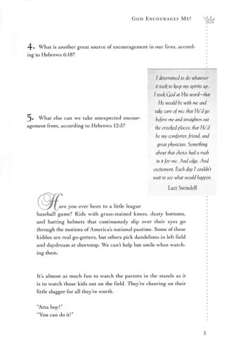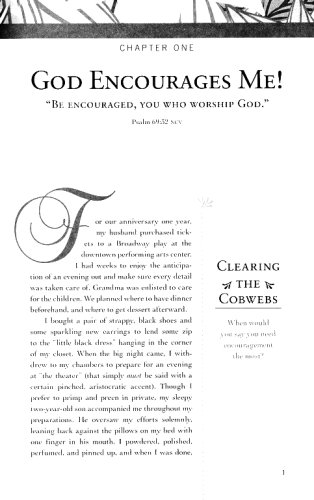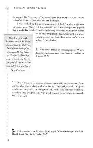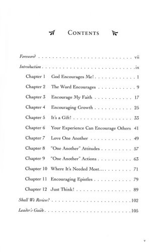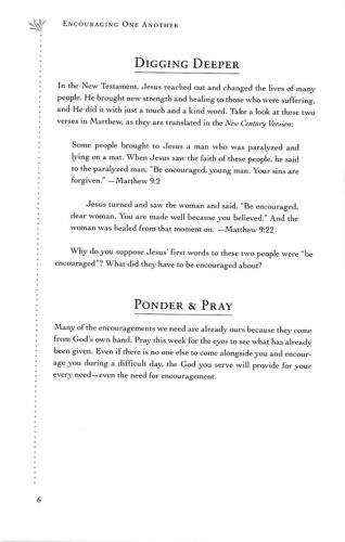 In Encouraging One Another, you will explore what Scripture has to say about the value God places on your life and how He notices all that you are doing. You will read passages that will lift your spirit as you hear God speaking His words of encouragement into your life. You will also discover that just as God lifts you up, He wants you to lift up others.