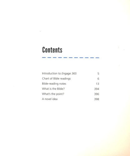 Engage365 explores the beginning of the world (Genesis 1-11), of God's chosen people (Genesis 12-50; Exodus 1-20), of God's song book (Psalms 1-23), of the church (Acts), and of life as a Christian (Colossians); plus the life and ministry of Jesus (Luke), and the end of everything (Revelation).