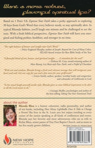 One touch is all it takes. One touch and you have that perfect cup. That perfect cup of espresso to wake you up, energize you, and help you face the day. Just like a perfect cup of espresso, God's Word contains the perfect balance of ingredients to wake up believers spiritually, energize the soul, and help believers be spiritually alert as they face their day. Espresso Your Faith takes a daily-shot approach to God's espresso–His Word–as readers explore the 30 keys from God's Word to staying spiritually alert. Based on 1 Peter 5:8, which warns believers to stay alert, humorist Rhonda Rhea takes a perky approach to helping readers understand what that means and helps them drink in God's instructions as it relates to being spiritually alert. Her humor will warm readers hearts while her practical insight will have them paying attention to the world around them with a fresh biblical perspective. She promises that before you know it, God will be gloriously energizing lives and having believers feeling perkier, healthier, and stronger.