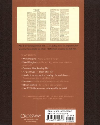 The ESV Journaling Bible provides the perfect way for you to keep a journal of your spiritual life right in the 2-inch margins of the Bible that you read and study every day.