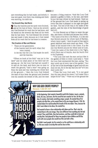 What about This?: Insights to tough questions about faith. Memorize This: Pull-out verses for memorizing. More to the Story: Who did what, when, where … and why it matters. Guess It!: Person, place, or thing? Guessing fun with 5 clues. Take Action: Reflections on how Scripture passages apply to life today. Facts from the Past: Learn more about clothes, houses, weapons, food, celebrations, and traditions in Bible times.