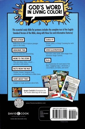 In this enhanced version of The Action Bible Study Bible ESV, 40 vivid, full-color illustrated pages by comic book artist Sergio Cariello bring Scripture to life for preteens.  It includes engaging special features such as memory verses and games to help kids ages 8 and up discover the joy of reading and understanding God’s Word.