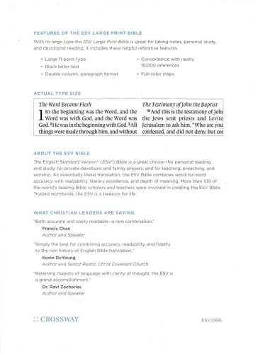With easy-to-read 11.5-point type, the ESV Large Print Bible features an extensive reference concordance and full-color maps—great for pastors, students, or others looking for a large-print edition for preaching, reading, or study.