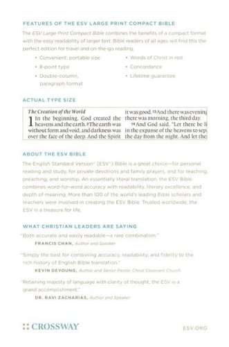 The ESV Large Print Compact Bible combines the benefits of a compact format with the easy readability of larger text.
