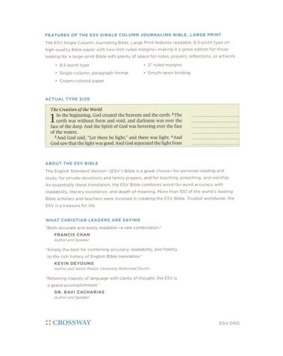 With 9.5-point type, the ESV Single Column Journaling Bible, Large Print features the same high-quality Bible paper and two-inch ruled margins for notes, prayers, and artwork as the original ESV Single Column Journaling Bible.