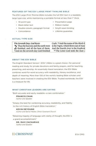The ESV Large Print Thinline Bible includes the entire ESV text in a readable, large type size, while maintaining a portable format at less than one inch thick, making it a great choice for easy transport.