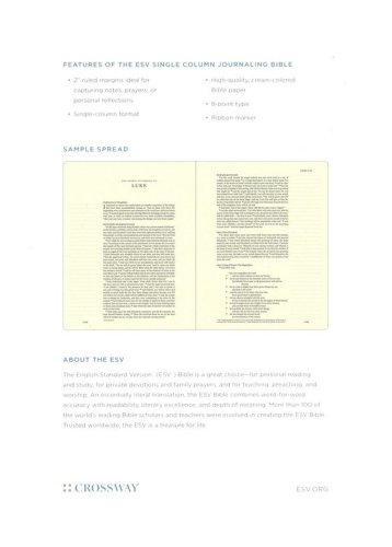 The ESV Single Column Journaling Bible is laid out in an easy-to-follow, single-column format with ruled lines in the extra-wide margins, allowing readers to capture notes, prayers, or personal reflections alongside the text.