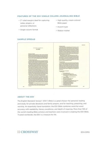 The ESV Single Column Journaling Bible is laid out in an easy-to-follow, single-column format with ruled lines in the extra-wide margins allowing readers to capture notes, prayers, or personal reflections alongside the text.