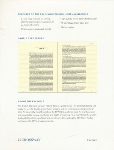 The ESV Single Column Journaling Bible is laid out in an easy-to-follow, single-column format with ruled lines in the extra-wide margins allowing readers to capture notes, prayers, or personal reflections alongside the text.