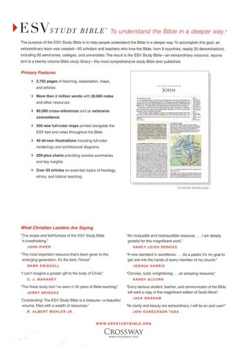 The ESV Study Bible—created by a diverse team of 95 leading Bible scholars and teachers—features 20,000+ study notes, 80,000 cross–references, 200+ charts, 50+ articles, 240 full–color maps and illustrations, and more.