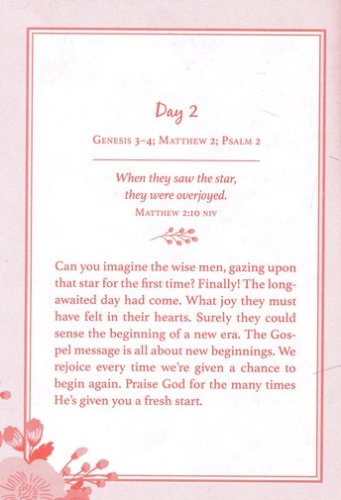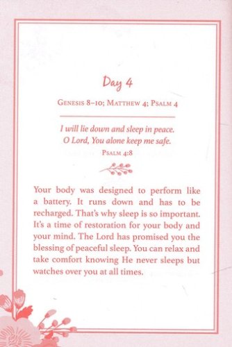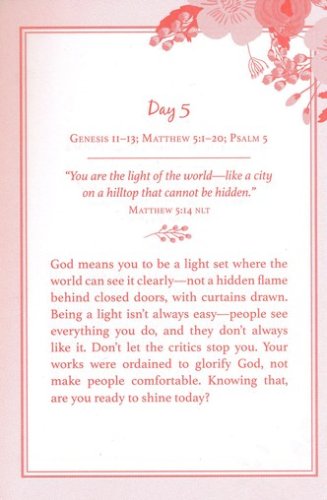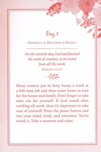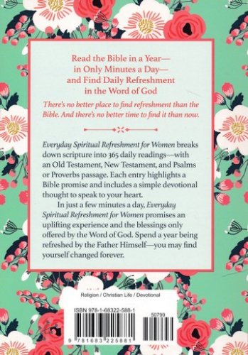Everyday Spiritual Refreshment or Women breaks down scripture into a 365-Day Bible reading plan—with an Old Testament, New Testament, and Psalms or Proverbs passage for every day. Each entry highlights a Bible promise and includes a simple devotional thought to speak to your heart.