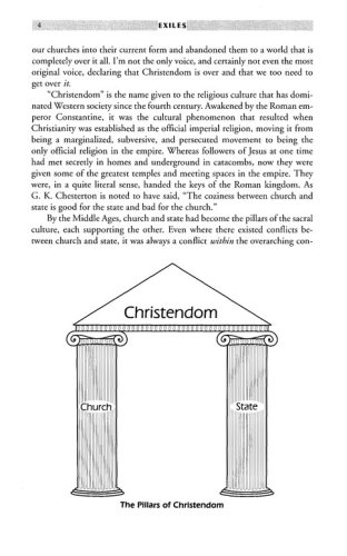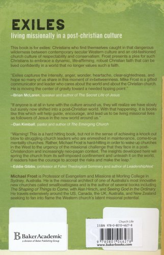 Exiles: Living Missionally in a Post-Christian Culture presents a biblical, Christian worldview for the emergent church–people who are not at home in the traditional church or in the secular world. As exiles of both, they must create their own worldview that integrates their Christian beliefs with the contemporary world. Exiles seeks to integrate all aspects of life and decision-making and to develop the characteristics of a Christian life lived intentionally within emerging (postmodern) culture. It presents a plea for a dynamic, life-affirming, robust Christian faith that can be lived successfully in the post-Christian world of twenty-first century Western society. This book will present a Christian lifestyle that can be lived in non-religious categories and be attractive to not-yet Christians.