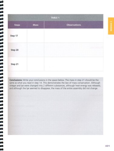 This student notebook journal is divided into sections that correspond to the text. First, an introduction provides rubrics, notes and schedules. This is followed by each module's notebooking pages, which include blank note-taking pages along with room to answer the "on your own" questions, study guide questions, and extra practice problems. This is followed by the "Experiments" section, which features lab reports for every experiment in the text; forms include the objective, materials needed, primary question for the experiment, and procedure, as well as room to record the student's hypothesis, data, and observations. Finally there's a brief section on creating and interpreting graphs, which will help students understand how to create accurate and appropriate line graphs from data, and also how to interpret the most common line graphs.