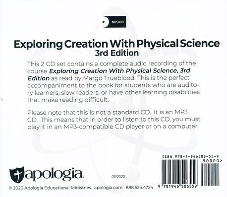 This audiobook CD is an audio recording of the Apologia textbook Exploring Creation with Physical Science Textbook, 3rd Edition (sold-separately). Perfect for students who are auditory learners, slow readers, or who have disabilities that make reading difficult! This is an MP3-CD; you must have an MP3-compatible CD player or computer to listen. Grade 8.