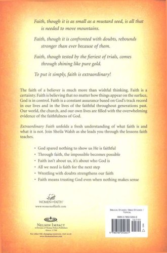Extraordinary Faith unfolds a fresh understanding of what faith is and what it is not.  Join Sheila Walsh as she leads you through the lessons faith teaches.God spared nothing to show us He is faithfulThrough faith, the impossible becomes possibleFaith isn't about us, it's about who God isAll we need is faith for the next stepWrestling with doubts strengthens our faithFaith means trusting God even when nothing makes sense