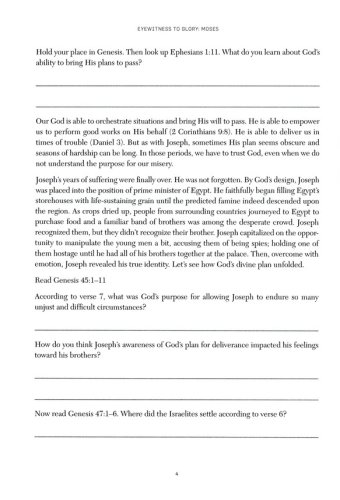 Through this study, you will follow Moses along his rough-and-tumble journey from his unlikely station as prince of Egypt to lonely fugitive and shepherd of his father-in-law’s flock. You will watch as the stammering, reluctant follower of God grows into one of the greatest leaders who ever lived. You will witness God’s active presence continually working on behalf of His people. Through Moses’ story, you will learn to discern God’s active presence continually working on your behalf as well. You, too, will become an eyewitness to His glory.