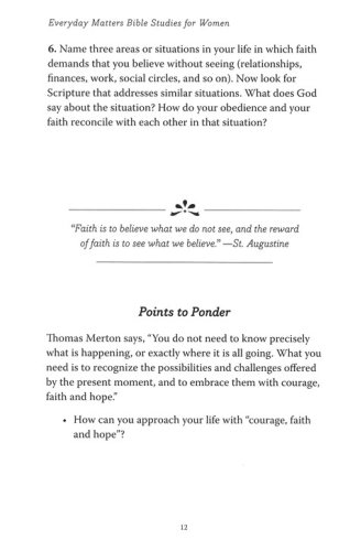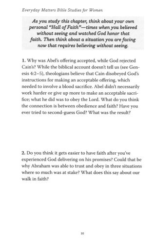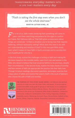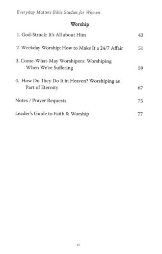 Develop the spiritual disciplines of "faith" and "worship" with this 8-chapter Bible study guide. It can be used as a stand alone Bible study guide for individuals and groups, or as a companion to the Everyday Matters Bible for Women. The articles, discussion questions, and leader guide help women delve deeper into these life enhancing practices.