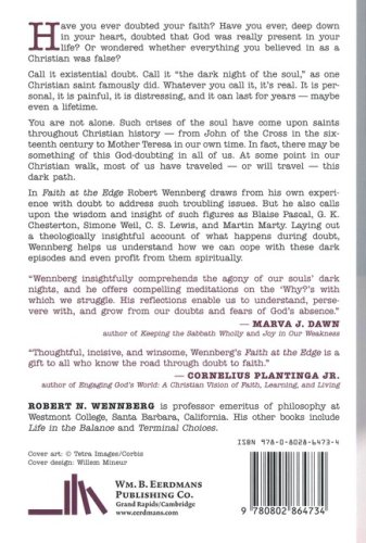 Have you ever doubted your faith? Have you ever, deep down in your heart, doubted that God was really present in your life? Or wondered whether everything you believed in as a Christian was false? / Call it existential doubt. Call it “the dark night of the soul,” as one Christian saint famously did. Whatever you call it, it’s real. It is personal, it is painful, it is distressing, and it can last for years — maybe even a lifetime. / You are not alone. Such crises of the soul have come upon saints throughout Christian history — from John of the Cross in the sixteenth century to Mother Teresa in our own time. In fact, there may be something of this God-doubting in all of us. At some point in our Christian walk, most of us have traveled — or will travel — this dark path. / In Faith at the Edge Robert Wennberg draws from his own experience with doubt to address such troubling issues. But he also calls upon the wisdom and insight of such figures as Blaise Pascal, G. K. Chesterton, Simone Weil, C. S. Lewis, and Martin Marty. Laying out a theologically insightful account of what happens during doubt, Wennberg helps us understand how we can cope with these dark episodes and even profit from them spiritually.