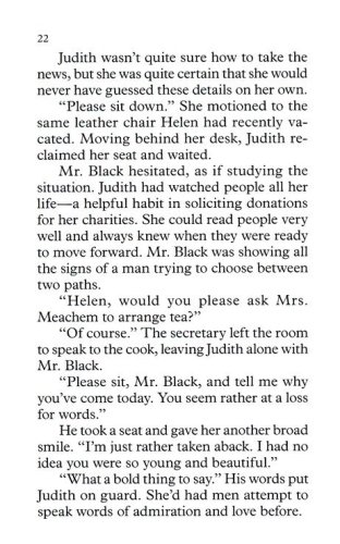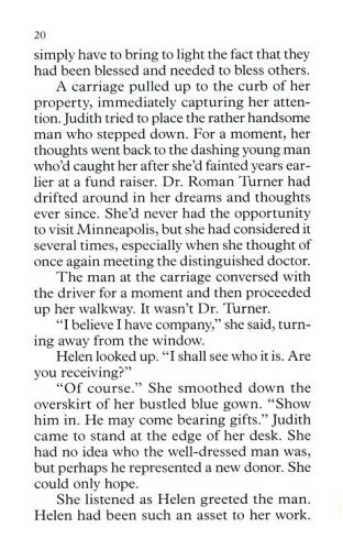 Roman Turner, a local physician with a heart for the poor, harbors a grudge against Judith's grandfather. Years ago, his unethical actions ruined Roman's family forever. When Roman meets Judith again, he is shocked to learn the woman he's thought about all these years is related to the one man he can't forgive.