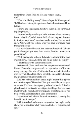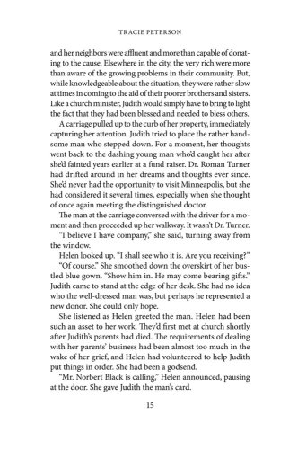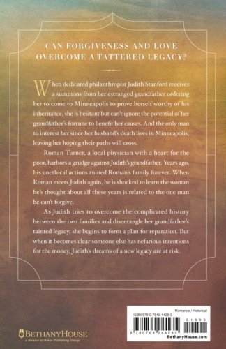 Roman Turner, a local physician with a heart for the poor, harbors a grudge against Judith's grandfather. Years ago, his unethical actions ruined Roman's family forever. When Roman meets Judith again, he is shocked to learn the woman he's thought about all these years is related to the one man he can't forgive.