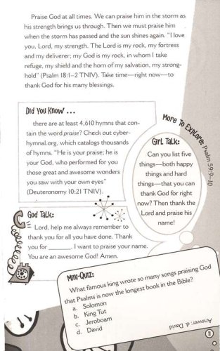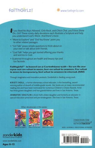 If you liked No Boys Allowed, Girlz Rock, and Chick Chat, you’ll love Shine On, Girl! These ninety daily devotions each illustrate a Scripture and help you understand God’s Word. And there’s more: “More to Explore” and “Did You Know” sections point to other related passages. “Girl Talk” poses simple questions to think about on your own or talk about with friends. “God Talk” helps you get started offering your thanks and worries to God. Scattered throughout are health and beauty tips and fun factoids. Faithgirlz!™ is based on 2 Corinthians 4:18—So we fix our eyes not on what is seen, but on what is unseen. For what is seen is temporary, but what is unseen is eternal. (NIV) —Inner Beauty, Outward Faith.