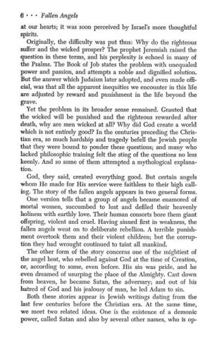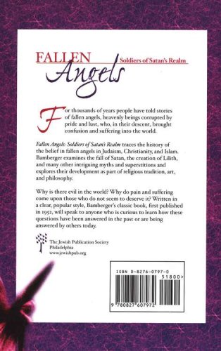 Fallen Angels: Soldiers of Satan's Realm traces the history of the belief in fallen angels in Judaism, Christianity and Islam. Bamberger examines the fall of Satan, the creation of Lilith, and many other intriguing myths and superstitions. His presentation also reveals a basic divergence between Judaism and Christianity in their respective attitudes toward the devil. The concluding chapter of the work deals with the return of the devil to prominence in contemporary religious thought and shows how Judaism seeks its own solution to the problem of evil. Paperback.