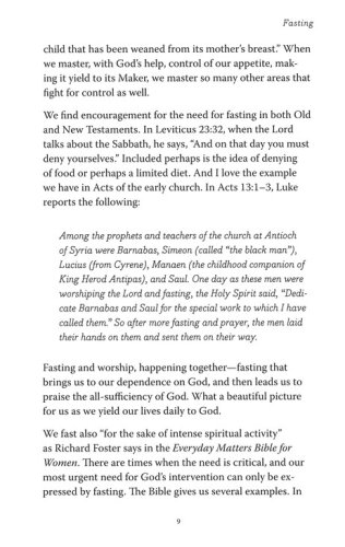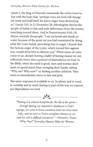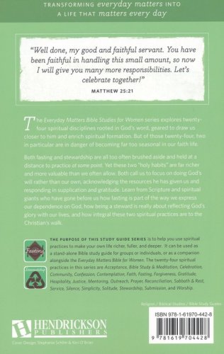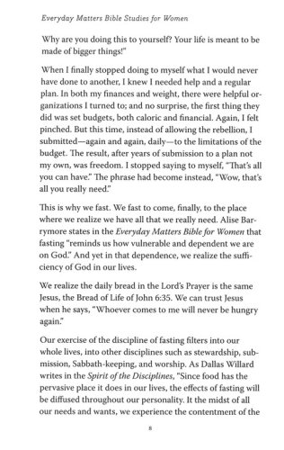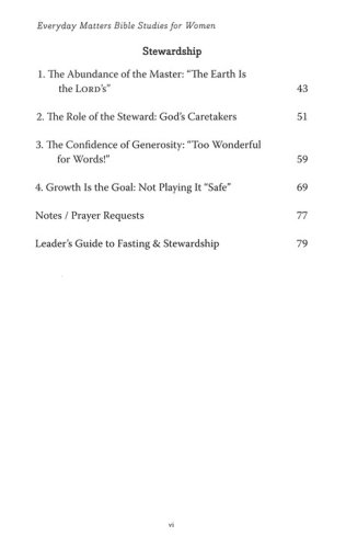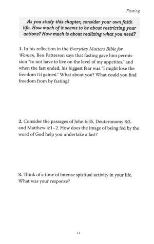 Develop the spiritual disciplines of "fasting" and "stewardship" with this 8-chapter Bible study guide. It can be used as a stand alone Bible study guide for individuals and groups, or as a companion to the Everyday Matters Bible for Women. The articles, discussion questions, and leader guide help women delve deeper into these life enhancing practices.
