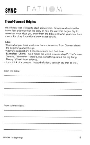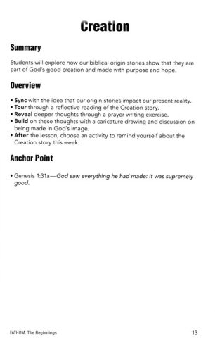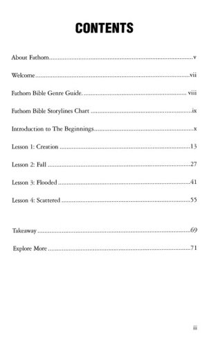 In The Beginnings study, your group will be handed the keys to exploring the mystery and beauty of the origin of the universe, the birth of the human race, and the interrelationship between God, humans and nature. From there, you’ll see how God’s relationship with humankind led to the founding of a people called to belong to God, and the themes of covenant, grace and redemption that are the foundation of the whole bible story. This study will dive into Genesis 1-11 A Deep Dive into the Story of God Fathom is a Bible study for teens that covers the Old and New Testaments in 18-4 session studies. The lessons are a blend of narrative and traditional theological approaches to understanding the bible story. Each lesson will focus on one passage that will launch into the larger context of God's story, and how that story is meant to be theirs. Fathom is suitable for groups with middle schoolers, high schoolers, and any combination of the two.Acknowledges the differences between older and younger youth and the way they learn. It provides activities specific to each age group, and gives leaders the option to let youth take ownership of their learning through teaching and leading alongside adults. Fathom creates space and tension for teens to wrestle with how to interpret and experience the bible.
