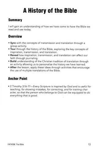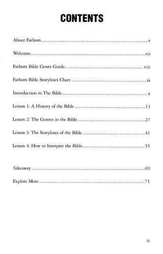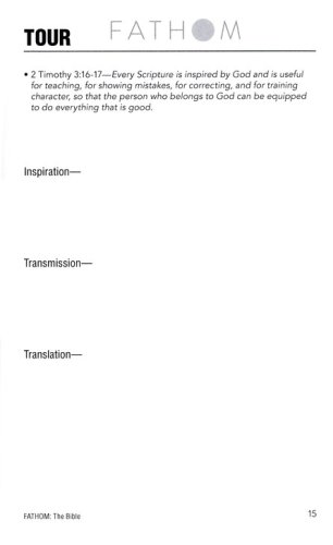 The Bible is what sets Fathom apart from all other Bible studies. The Fathom series is designed to help teens break down the barriers of fear, awkwardness and unfamiliarity to reading and studying the Bible for themselves and it starts with The Bible. In a clear and engaging way, it will help your group learn where the Bible came from and how to use Bible scholar recommended tools to understand and interpret it – tools that are utilized throughout the Fathom series. A Deep Dive into the Story of God Fathom is a Bible study for teens that covers the Old and New Testaments in 18-4 session studies. The lessons are a blend of narrative and traditional theological approaches to understanding the bible story. Each lesson will focus on one passage that will launch into the larger context of God's story, and how that story is meant to be theirs. Fathom is suitable for groups with middle schoolers, high schoolers, and any combination of the two.Acknowledges the differences between older and younger youth and the way they learn. It provides activities specific to each age group, and gives leaders the option to let youth take ownership of their learning through teaching and leading alongside adults. Fathom creates space and tension for teens to wrestle with how to interpret and experience the bible.