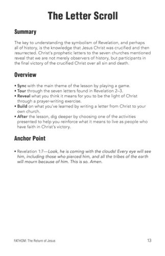The second coming of Jesus has been a topic of fascination for both scholars and lay people for centuries. The accounts of Jesus’ return found throughout the Bible, especially in Revelation, are put forth with a cinematic quality that is both enrapturing and unnerving. In this study, we’ll explore apocalyptic literature throughout the Bible along with what it does and doesn’t tell us about Jesus’ return, and the key takeaways that these scriptures have for our faith. A Deep Dive into the Story of God Fathom is a Bible study for teens that covers the Old and New Testaments in 18 4-session studies. The lessons are a blend of narrative and traditional theological approaches to understanding the Bible story. Each lesson will focus on one passage that will launch into the larger context of God's story being studied,and how that story is meant to be theirs. Fathom is suitable for groups with middle schoolers, high schoolers, and any combination of the two. But unlike many other resources, it acknowledges the differences between older and younger youth and the way they learn. It provides activities specific to each age group, as well as activities for mixed groups in which older youth have leadership opportunities. Fathom gives leaders the option to let youth take ownership of their learning through teaching and leading alongside adults. Fathom creates space and tension for teens to wrestle with how to interpret and experience the Bible.